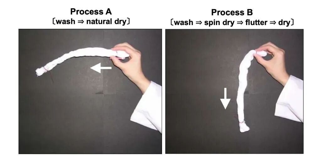 比如,2020 年的一篇著作里就提到,若是洗完的袜子不经过甩干,径直自然晾干,会变得很“坚挺”(如下图 A)。但若是晾干之前用洗衣机甩干,况兼抖了抖,大略减少残余水分对棉花纤维之间的影响,让袜子不那么“坚挺”(如下图 B)。