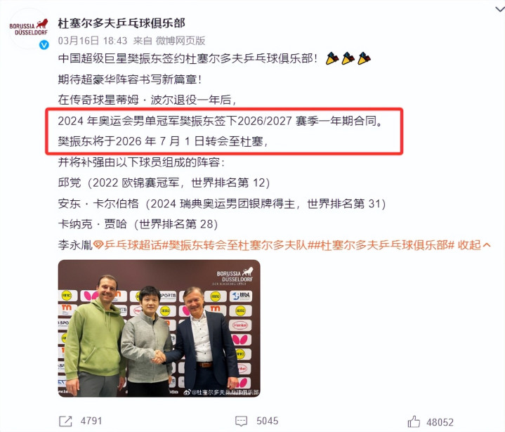 本月16号,杜塞尔多夫俱乐部已而官宣,樊振东将在本赛季限制后加盟。