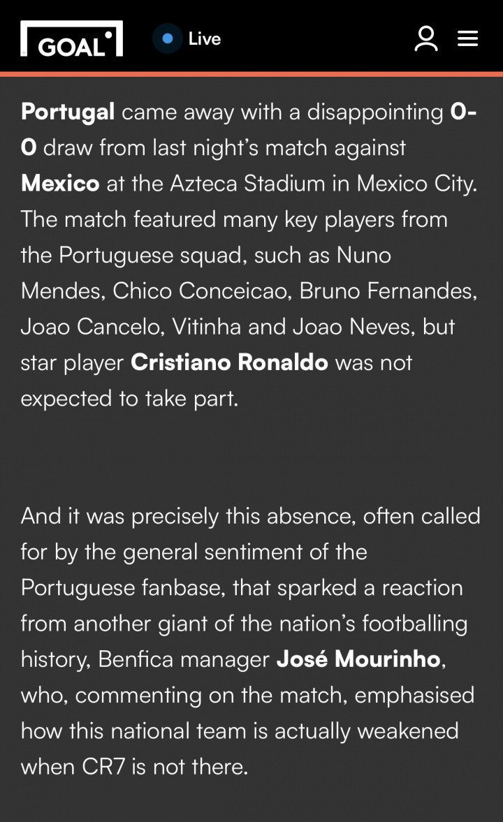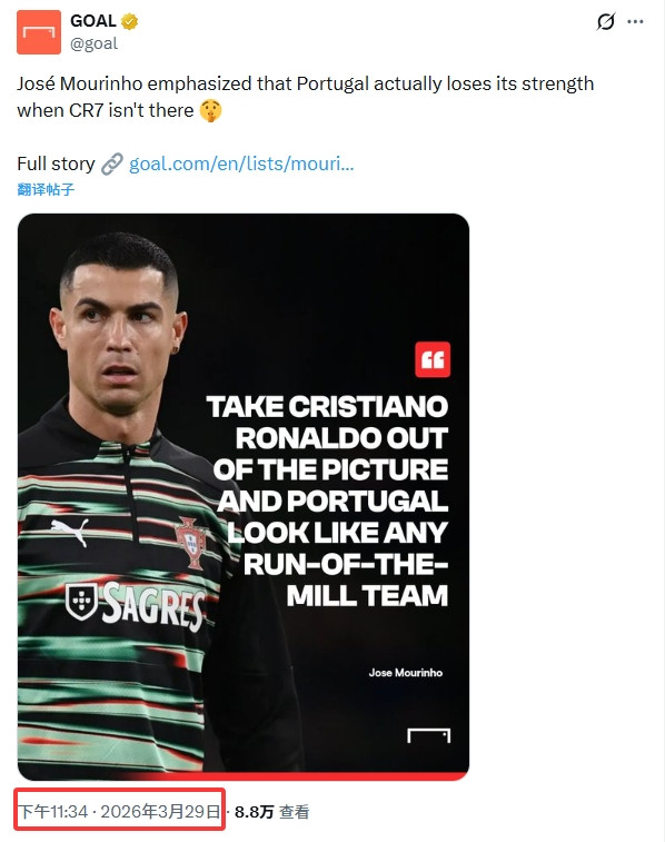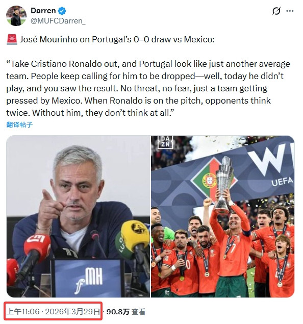 本色发布的时代为北京时代3月29日11:06分,也等于葡萄牙当地时代凌晨4:06分。而葡萄牙0-0墨西哥比赛时代为10:57分为止(葡萄牙当地时代凌晨3:57),无法得知穆里尼奥那时是否正在接收采访或受邀评释点评选赛。