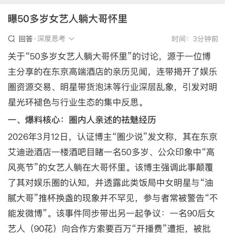 不外,这次爆料的真确性也激励了不少磋磨。博主并未显现涉事女艺东说念主的具体身份,也莫得提供相片、视频等实锤把柄,仅以笔墨姿色现场情况,随后还删除了关联博文。这也导致网友启动根据年事和公众形象张开臆想,李冰冰、宁静、吴越、俞飞鸿等多位五十多岁、形象正面的资深女艺东说念主皆被累赘,全球纷纷在评述区磋磨“这位艺东说念主到底是谁”。