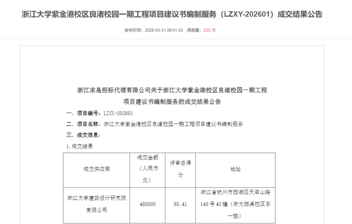 该公告长远,形状编号LZXY-202601,主要倡导信息为浙江大学紫金港校区良渚校园一期工程形状冷落书编制就业,最终由浙江大学建筑规画究诘院有限公司以48.8万元成交,评审总得分88.41。
