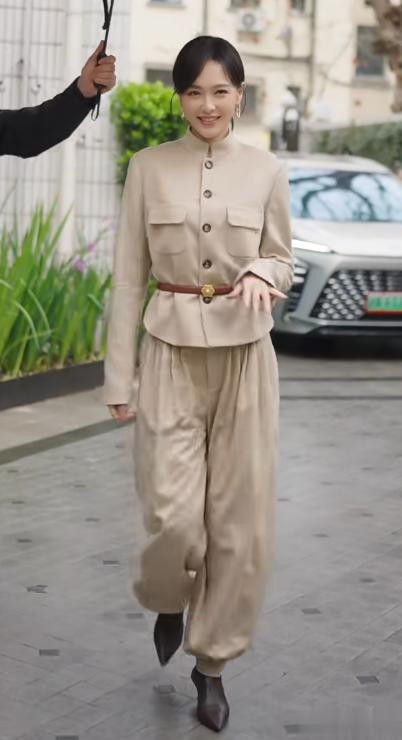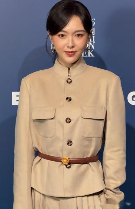 本日唐嫣穿了孑然卡其色工装风立领套装,修身的版型勾画出纤细的躯壳弧线,一头短发造型干练,温婉的气廉正接拉满。