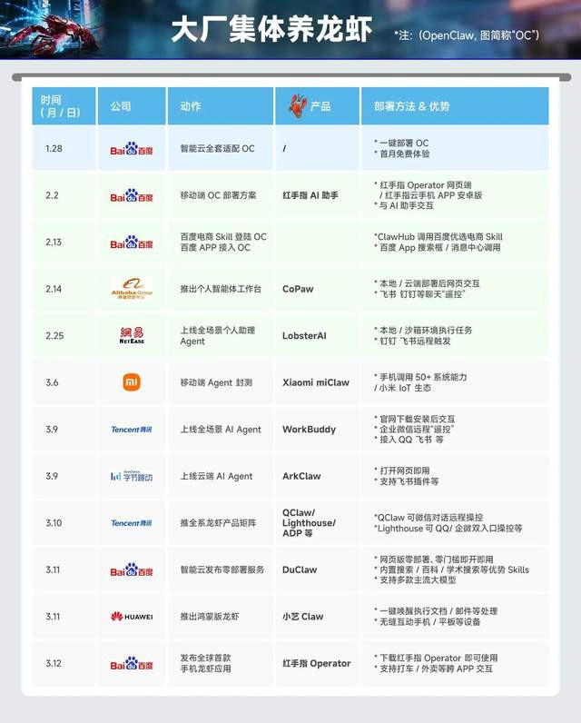 从1月到面前,国内下场“养龙虾”的大厂已卓绝十家。百度、腾讯、阿里、字节、小米、华为、360……简直扫数叫得上名字的互联网公司,都有布局。