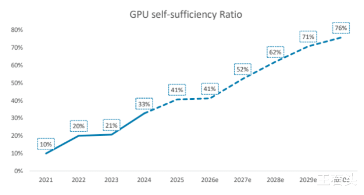 字据他们的测算,到2030年,我们国度AI GPU芯片的自给率将从2024年的33%连气儿飙升到76%。
