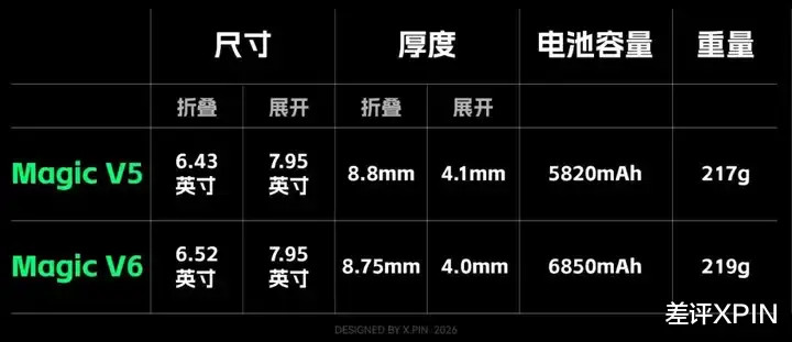 而在机身限度上,Magic V6 的尺寸和分量,也依然处在折叠屏的第一梯队。对比上一代,诚然电板增多了 1000mAh,但基本不影响机身的浮薄。
