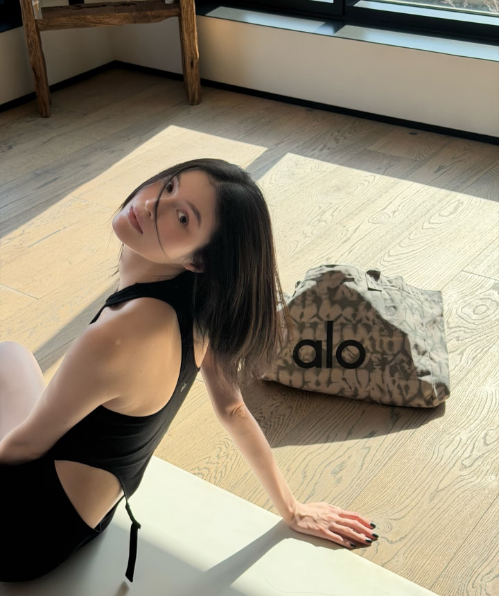 她身穿玄色瑜伽服,躺在垫子上,情状的看向镜头,素面朝天的步地也依然很漂亮。